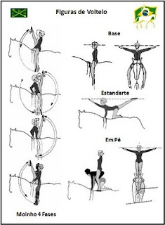 Descrição dos exercícios obrigatórios :Base ;Na posição básica, o volteador deve estar sentado imediatamente atrás do cilhão, olhando para a frente, com uma perna de cada lado da coluna do cavalo, segurando uma alça do cilhão em cada mão. A pelve deve acompanhar o movimento do cavalo. Os MMII devem envolver o cavalo, em contato suave. Os pés devem apontar para o solo, mantendo o alinhamento da perna, o dorso do pé deve estar apontado para a frente. Variação: o volteador mantém a posição básica com abdução dos membros superiores. Os MMSS, pescoço e ombros devem estar alongados elasticamente, e não devem ser rígidos. Atividade Motora: melhora equilíbrio de tronco, principalmente com o auxílio da variação do exercício; melhora na postura e absorção da oscilação do cavalo ao passo; o cavalo em círculo, conduzido por guia longa, favorece as reações de proteção e endireitamento do indivíduo. Adaptação: correção postural, não utilização do cilhão por encurtamento da musculatura adutora, espasticidade e/ou déficit de força muscular.Variações com os membros superiores para maior recrutamento de equilíbrio e coordenação motora. Manter a dorsiflexão em casos de inibição de padrão patológico.Moinho ;A partir da posição básica, o volteador executa uma rotação completa sobre o cavalo, em quatro fases de tempo iguais. Fase 1 : a perna externa passa sobre o pescoço do cavalo (externa em relação a parte interior do círculo), cada alça é largada e retomada à medida que a perna passa por ela. Esta fase termina com o volteador sentado de lado voltado para o interior do círculo, sobre o quadril, pernas unidas envolvendo o cavalo. Fase 2 : a outra perna passa então sobre a garupa do cavalo, termina com o volteador sentado na posição básica invertida. Fase 3 : a perna interna passa sobre a garupa do cavalo, e o volteador senta de lado voltado para o exterior do círculo. Fase 4 : a perna que está junto ao cilhão passa sobre o pescoço do cavalo, cada alça é largada e retomada à medida que a perna passa por ela, termina com o volteador na posição básica. O moinho é executado com ritmo de contagem em quatro tempos, cada perna deve descrever um arco uniforme e amplo, idealmente na vertical. A cabeça e os ombros devem acompanhar a rotação de cada perna com manutenção de postura.Atividade Motora: ritmo, coordenação motora, fortalecimento muscular (músculos adutores e abdutores de quadril, flexores de quadril e abdominal).Adaptação: as alças do cilhão podem ser de tamanho menor e evoluírem para as de tamanho normal, devido à presença de encurtamento muscular e/ou espasticidade. Pode ser realizado primeiramente com o auxílio de um terapeuta lateral durante as transferências com o cavalo parado, evoluindo para a realização das mudanças de postura com o cavalo em movimento.Ajoelhado / Estandarte; A partir da posição básica, o volteador passa à posição ajoelhada. Suavemente, com os dois joelhos simultaneamente, o dorso dos pés, os tornozelos e após estes os joelhos devem tocar a garupa do cavalo. O volteador deve estar sempre olhando para a frente, a perna externa deve cruzar diagonalmente sobre a coluna do cavalo, com o pé interno do volteador colocado no lado externo também. O peso deve estar distribuído uniformemente através da perna, tornozelo e dorso do pé, o joelho interno deve estar ligeiramente à frente da coxa, a fim de auxiliar o joelho e quadril a absorverem suavemente o movimento do cavalo. A perna externa é então estendida, a fim de que o pé fique colocado acima da linha horizontal formada através dos ombros e quadril do volteador, ao mesmo tempo o braço interno é alongado para a frente. A planta do pé externo deve estar virada para cima e a palma da mão interna para baixo, com os dedos fechados. A mão externa permanece na alça, com o braço ligeiramente flexionado para absorver o movimento do cavalo. A silhueta do volteador deve formar um arco suave e equilibrado, desde a ponta dos dedos da mão até os dedos do pé. O eixo longitudinal do corpo do volteador deve estar no mesmo alinhamento da coluna do cavalo.Atividade Motora: descarga de peso, equilíbrio dinâmico, fortalecimento muscular (músculos flexores de quadril, glúteo médio e mínimo, paravertebrais), reações de proteção e endireitamento, noção espacial, lateralidade, postura. Adaptação: o exercício pode ser iniciado no colchonete, depois no barril e/ou com o cavalo parado e com as mãos nas alças, evoluindo para a liberação das mãos alternadamente. A evolução do ajoelhado é o estandarte que pode ser feito primeiramente sem a liberação das mãos, apenas com a extensão de uma perna e evoluir para a retirada e extensão do braço contralateral; pode ser realizado no colchonete e no barril como preparação para o movimento.Em Pé ; A partir da posição básica, o volteador passa suavemente à posição de joelhos simultaneamente com as duas pernas, o dorso dos pés, o tornozelo e os joelhos devem tocar as costas do cavalo suavemente. Imediatamente o volteador transfere o peso do corpo para os braços e pula para de pé, apoiando-se na planta dos pés, que devem estar apontando para a frente. Para compensar o movimento em círculo do cavalo, a descarga de peso deve estar no pé interno do volteador. A evolução do exercício é extensão de tronco e encaixe de quadril; quando estiver em equilíbrio com o movimento tridimensional do cavalo solta as alças e eleva os ombros até chegar à posição vertical, quando então abre os braços lateralmente. O movimento do cavalo é absorvido pelos tornozelos, joelhos e quadril do volteador; seu peso deve estar bem distribuído na planta dos pés, que devem estar em contato total com o cavalo (Paes et al, 2001).Atividade Motora: adequação tônica, descarga de peso, equilíbrio dinâmico, fortalecimento muscular de MMII, reações de proteção e equilíbr